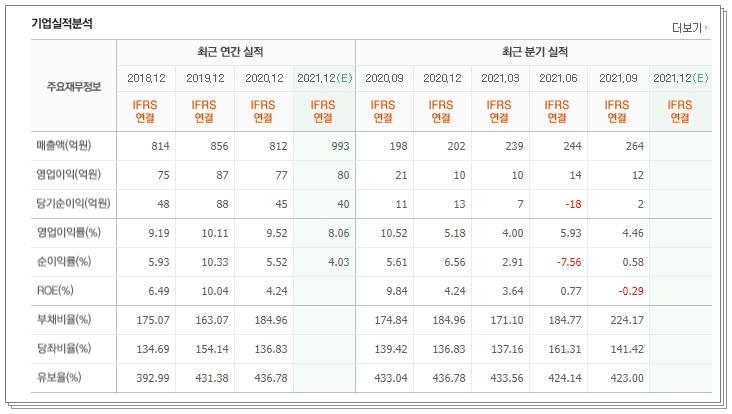올해는 이보다 좀 더 많은 993억원의 매출 달성이 예상됩니다. 영업이익은 2018년 75억원 이익 발생됐으며 올해는 이보다 5억원 좀 더 많은 80억원 달성했습니다. 순이익은 오히려 2018년 흐름보다 더 떨어져서 2018년 48억원의 순이익 이후 2021년은 40억원 발생됐습니다. 동사의 순이익 흐름이 가장 좋았던 해는 2019년으로 그 해에는 88억원의 이익이 생겼습니다. 현재 동사의 per은129배 정도입니다.