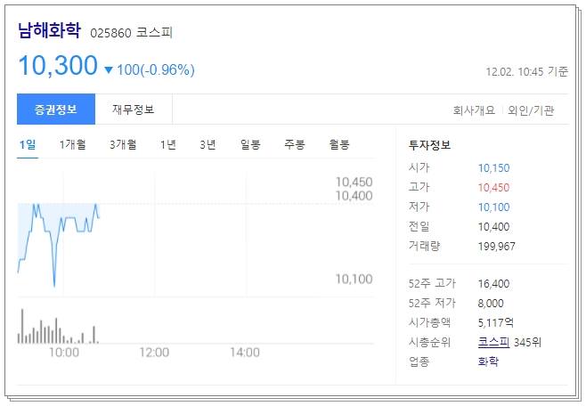 마지막으로 차트 살펴보겠습니다. 현재 전일대비 0.96% 하락한 10,300원에 거래되고 있습니다. 52주 고가는 16400원이었으며 52주 저가는 8000원이었습니다. 시가총액은 5117억원으로 시총순위는 코스피 345위에 해당합니다.
