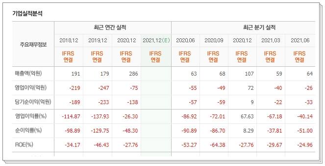 최근 분기 실적을 보면 64억원의 매출을 달성했습니다. 매출액은 꾸준히 흑자이지만 영업이익은 계속 적자 상황입니다. 2018년 -219억원, 2019년 -247억원, 2020년은 -75억원입니다.