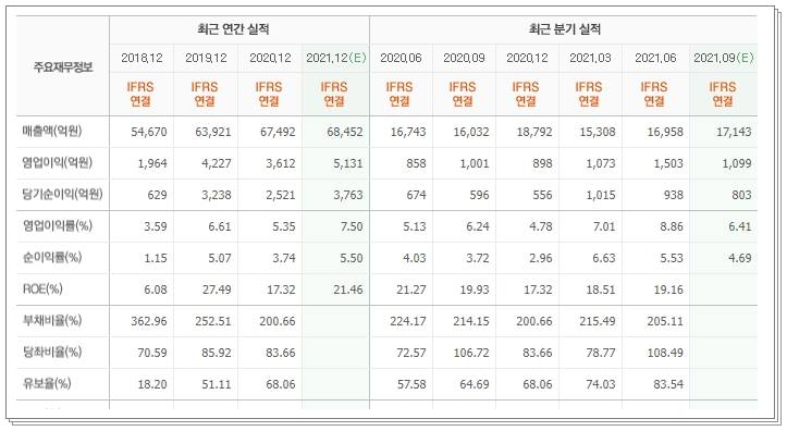 다음으로 매출 알아보도록 하겠습니다. 동사의 재무제표를 살펴보면 2018년부터 흐름이 계속 탄탄하게 흘러가고 있음을 알 수 있습니다. 매출액의 증가와 함께 영업이익, 당기순이익 모두 계속해서 전년대비 증가하는 형국을 보여주고 있습니다. 매출액은 2018년 54670억원을 시작으로 2021년은 68452억원을 달성할것으로 예상됩니다.