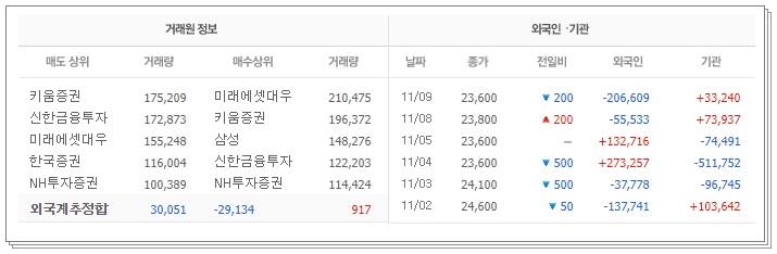 다음으로 매매동향입니다. 기관 및 외국인의 매수 및 매도세가 번갈아가며 나오고 있는 상황입니다. 마치 기관이 던지면 외국인이 다시 받고, 외국인이 던지면 기관이 다시 받는 듯한 모습입니다.
