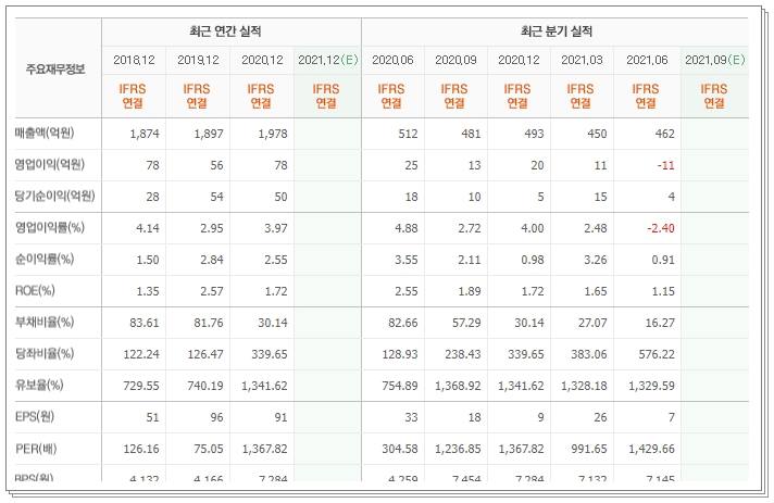 다음으로 동사의 매출을 알아보도록 하겠습니다. 2018년부터 동사의 매출은 비슷한 흐름으로 흘러가고 있습니다. 2018년 1874억원을 시작으로 2019년은 1897억원 매출을 달성했습니다. 그 뒤, 2020년은 1978억원을 달성했습니다. 영업이익도 계속 흑자로 2018년은 78억원이었으며 2019년은 소폭 떨어진 56억원 달성했습니다. 그 뒤 작년에는 78억원을 달성했습니다.
