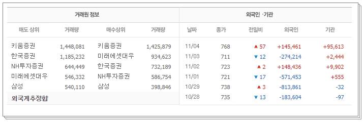 다음으로 매매 동향입니다. 10월 마지막 주부터의 흐름을 살펴보면 기관 및 외국인 모두 매도세가 강했지만 이스타항공 재인수 관련 기사 내용이 나온 이후 외국인과 기관 모두 동사의 주식을 다시 사들이고 있는 흐름이 강합니다. 기관은 11월 시작이후 계속 동사의 주식을 사들이고 있으며 외국인 역시 매수세가 좀 더 강해지고 있습니다.