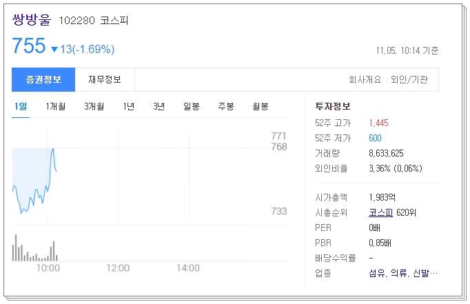 마지막으로 차트입니다. 현재 전일대비 1.69% 하락한 755원에 거래되고 있습니다. 52주 고가는 1445원이었으며 52주 저가는 600원이었습니다. 현재 시가총액은 1983억원으로 코스피 620위에 해당합니다.