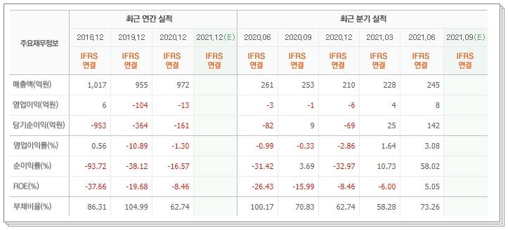 2018년 6억원 달성 이후 2019년은 -104억원이 되었으며 2020년은 -13억원입니다. 2021년 상반기 흐름을 봤을 땐 다행스럽게도 적자 흐름을 면했기 때문에 올해는 흑자전환 추세 될것으로 예상됩니다. 하지만 당기순이익 및 순이익률로만 살펴봤을 땐 매출은 꾸준히 나왔음에도 2018년부터 계속 적자흐름임을 알 수 있습니다.