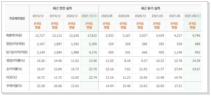 매출을 살펴보면 2018년 2089억원, 2019년은 2101억원입니다. 2020년은 2019년과 비슷한 매출액을 달성했습니다. 영업이익은 2018년은 적자였지만 2019년부터 흑자 전환되서 2019년은 110억원 달성, 2020년은 78억원을 달성했습니다.