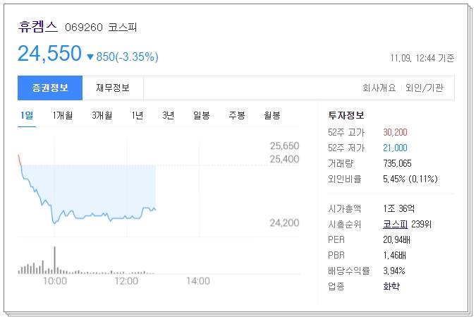 정밀화학과 기초화학을 연구, 생산, 공급하는 기업이며 환경을 위한 온실가스 저감을 목표로 기존 질산 공장에 이서 신규 질산 공장에 온실 가스 저감시설을 설치했습니다. 현재 un으로부터 추가적인 탄소배출권을 획득해서 추가적인 수익원을 확보한 바 있습니다. 휴켐스는 현재 24550원에 거래되고 있으며 52주 고가는 30200원, 52주 저가는 21000원이었습니다. 현재 시가총액은 1조 36억원으로 시총순위는 코스피 239위입니다.