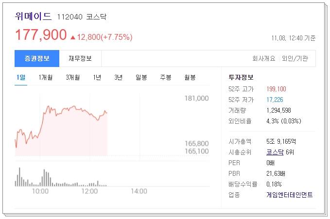 마지막으로 차트 살펴보도록 하겠습니다. 현재 전일대비 7.45% 상승한 177,400원에 거래되고 있습니다. 52주 고가는 199,100원이었으며 52주 저가는 17,226원이었습니다. 현재 시가총액은 5조 8999억원으로 코스닥 6위에 해당합니다.