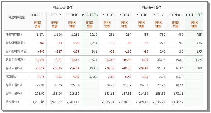 작년의 적자흐름으로 보자면 올해만 대략 14~15배 이상 성장한 셈입니다. 이 덕분에 작년까지 -184억원이었던 당기 순이익이 올해는 961억원을 달성할것으로 예상됩니다. 부채율 또한 100을 넘지 않으므로 탄탄한 흐름으로 볼 수 있습니다. 다만 올해 상승세가 눈에 띈 만큼 2022년의 흐름도 제대로 살펴볼 필요가 있을 둣 합니다.