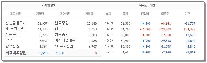유한양행 주가 전망 동사의 매매동향을 살펴보겠습니다. 매매 동향을 살펴보면, 11월을 기점으로 외국인들의 순매수세가 강해짐을 알 수 있습니다. 기관은 외국인들과는 다르게 11월 2일을 제외하고는 매도세가 좀 더 강합니다.