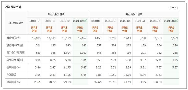 2021년 예상되는 매출액은 대략 17167억원입니다. 영업이익의 흐름도 매우 좋습니다. 2018년 영업이익은 501억원으로 2020년 영업이익은 843억원입니다. 올해의 영업이익은 작년에는 다소 못미치지만 그래도 688억원 정도 되리라고 보입니다. 그 외 영업이익률, 순이익률 및 부채비율 등의 흐름도 안정적입니다.