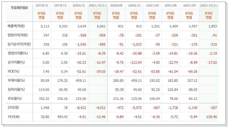 다만 영업이익은 2019년까지 338억원의 이익 달성 이후 2020년 코로나 19 이후 568억원의 손실 이후 올해도 역시 509억원의 손실이 이어질것으로 보입니다. 당기순이익 흐름도 좋지 않아서 2020년 적자 1540억원의 손실 이후 올해도 역시 적자 흐름일 것으로 보이며 대략 695억원 손실 발생으로 보입니다. 지옥 관련주로 주가가 오름세를 보여주긴 했지만 재무제표 흐름으로는 매수 진입하기에는 다소 보수적인 방향으로 접근해야할 듯 보입니다.