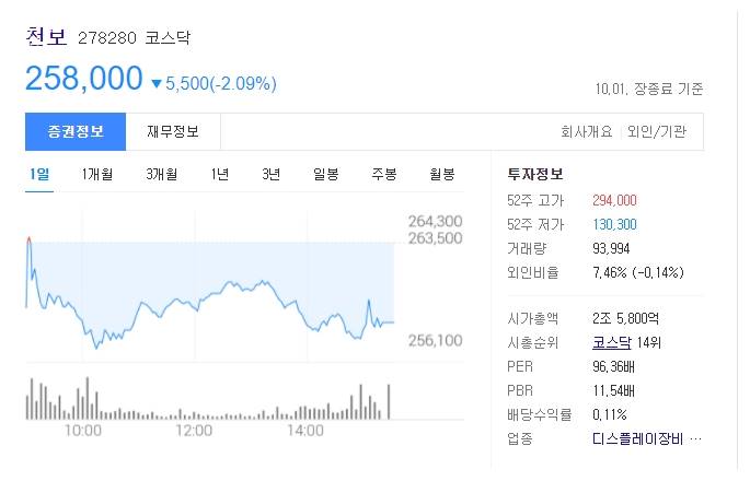 마지막으로 차트 살펴보도록 하겠습니다. 천보는 10월 1일 전일대비 -2.09% 하락한 258,000원에 종가마감했습니다. 52주 고가는 294,000원이었으며 52주 저가는 130,300원이었습니다. 현재 시가총액은 2조 5,800억원으로 코스닥 14위에 해당합니다.