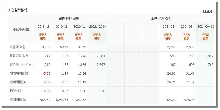 영업이익 또한 2018년 적자 흐름을 제외하고는 탄탄하게 흘러가고 있습니다. 특히 2020년과 비교했을 때 2021년은 2020년 대비 약 2배 정도의 수익이 예상됩니다. 2020년 영업이익이 1226억원이었다면 2021년은 2984억원까지 오르리라 보입니다. 당기순이익 또한 2020년과 비교했을 때 2배 정도 오를 것으로 보입니다. 영업이익률과 순이익률 모두 증가 추세입니다.