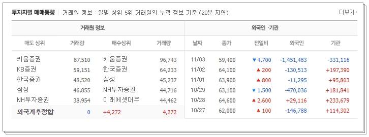 동사의 매매동향을 살펴보면 10월 마지막 주를 기점으로 외국인은 계속 순매도세가 강합니다. 다만 기관은 계속 순매수세를 유지하고 있었으나 11월 3일 카카오페이 상장일에 매도세가 더욱 강했습니다.