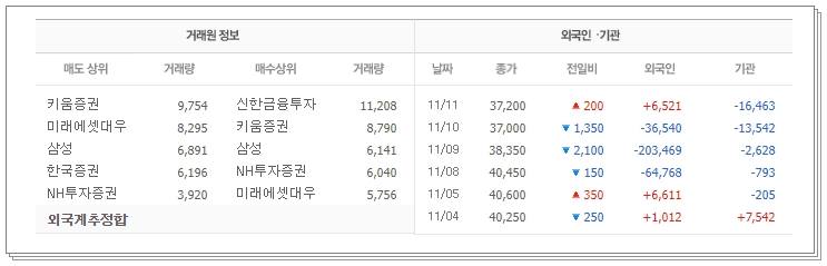 동사의 매매 동향을 살펴보겠습니다. 신규 수주가 내년부터 이어질 것으로 예상되면서 기관과 외국인의 매도세가 좀 더 강해지고 있습니다. 11월 이후 기관은 계속해서 매도하고 있는 입장입니다.