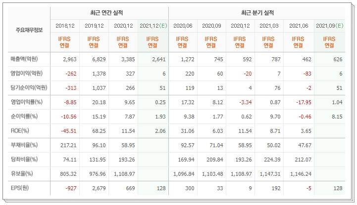 영업이익은 2018년 적자였지만 2019년 큰 폭의 매출 상승 덕분에 1378억원을 달성했습니다. 2020년 327억원으로 대폭 줄어들었고 올해의 예상 영업이익은 6억원 정도 될 것으로 예상됩니다. 다행스러운 점은 영업이익은 많이 줄어들었으나 부채비율은 대폭 줄어들고 있는 상황입니다. 현재의 per은 5.92배입니다.