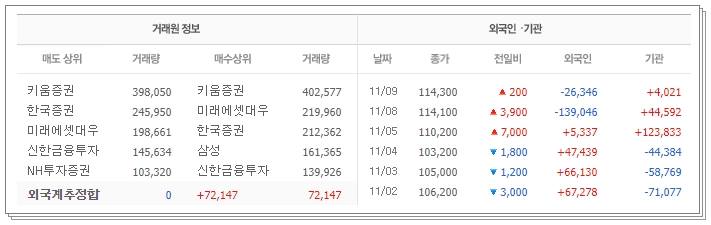 다음으로 매매동향입니다. 12월 검은사막 출시를 앞두고 있어서인지 기관은 11월 이후 꾸준히 매집하고 있음을 알 수 있습니다. 외국인 또한 11월 이후 순매수세가 강함을 알 수 있습니다. 다만 11월 8~9일 시황을 보면 기관은 여전히 순매수세가 강하지만 외국인은 11월 5일까지의 흐름에 비해 계속해서 매도세가 좀 더 강함을 알 수 있습니다.