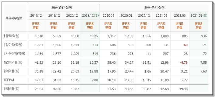 다음으로 매출 알아보도록 하겠습니다. 현재 매출액은 2018년부터 꾸준히 4000억원~5000억원대를 유지하고 있습니다. 2018년은 4048억원, 2019년은 5359억원, 2020년은 4888억원이며 올해는 대략 4025억원이 될 것으로 예상됩니다. 다만 영업이익을 살펴보자면 2020년까지의 영업이익은 1500~1600억원대를 유지하다가 2021년은 413억원 정도 달성할것으로 보입니다.