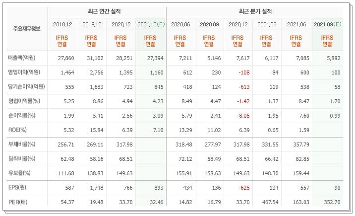 올해의 예상되는 매출액은 27394억원이며 영업이익은 1160억원으로서 2019년과 비교해보자면 절반으로 줄어든 셈입니다. 영업이익은 2020년 하반기에 적자흐름이 됐지만 올해 상반기부터 다시 흑자 전환 됐습니다. 현재 per은 2,25배입니다. 부채비율은 계속 증가하고 있는 흐름입니다.