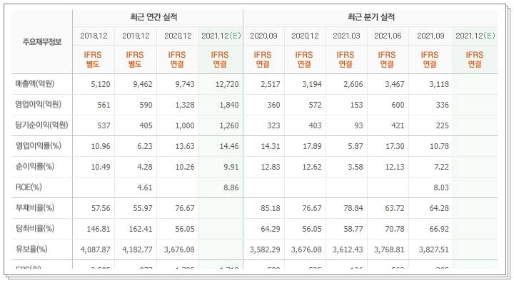 다음으로 동사의 매출을 알아보도록 하겠습니다. 매출 및 영업이익 모두 2018년부터 탄탄하게 꾸준히 증가하고 있음을 알 수 있습니다. 2018년 매출액 5120억원을 시작으로 2019년에는 9462억원을 달성했습니다. 2020년 역시 그 보다 더 성장한 9743억원을 달성했으며 올해는 12720억원을 달성할 것으로 보입니다.