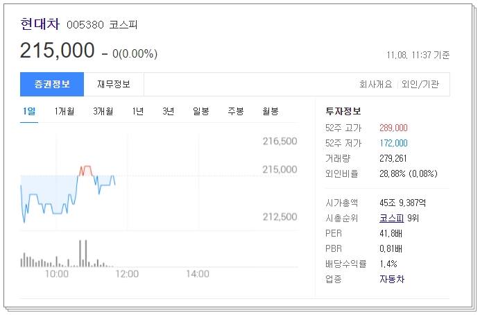 마지막으로 차트 살펴보도록 하겠습니다. 현재 전일 가격인 215,000원에 거래되고 있습니다. 52주 고가는 289,000원이었으며 52주 저가는 172,000원이었습니다. 시가총액은 45조 9387억원으로 시총순위는 코스피 9위에 해당합니다.