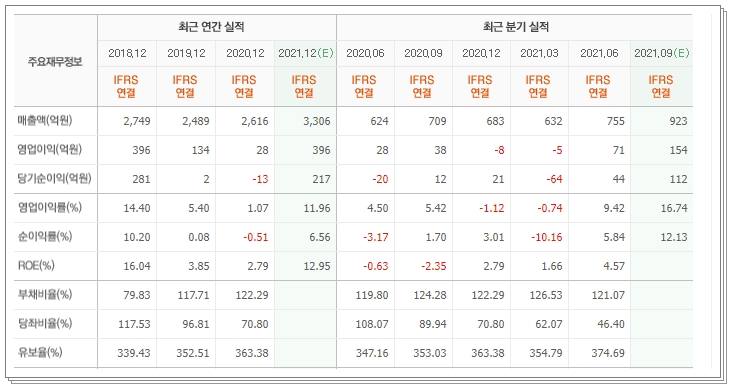 영업이익 또한 작년 2020년 28억원을 달성했으나 올해는 그보다 10배 이상 성장한 396억원을 달성할 것으로 보입니다. 당기순이익은 작년에 -13억원의 적자였으니 올해 영업이익, 매출이 크게 상승해서 217억원의 흑자 전환 추세 당기순이익이 발생할 것으로 보입니다. 부채비율은 소폭 늘어났으나, 현재 lipf6 가격 상승 및 중국 전력난 상황을 중장기적으로 바라봤을 때 2022년이 더 기대되는 기업입니다.