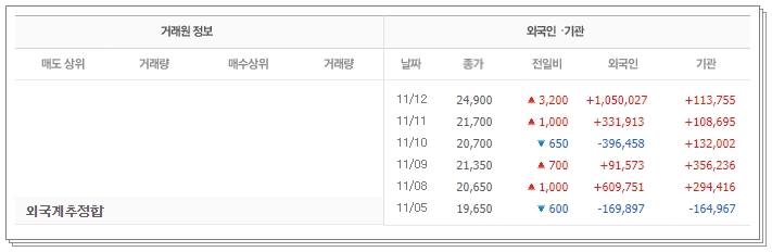 마지막으로 차트 살펴보겠습니다. 11월 11~12일 긴 장대양봉이 나오면서 상승 후 현재는 음봉이 나오면서 12일보다 0.40% 하락한 24,800원에 거래되고 있습니다. 52주 고가는 25250원이었으며 이 또한 11월 12일 기록입니다. 52주 저가는 9020원이었습니다.