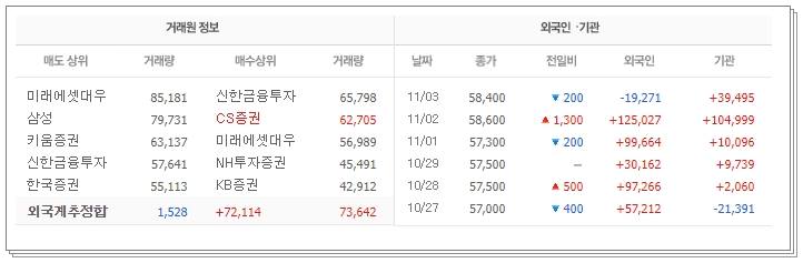 db하이텍 주가 전망 매매동향입니다. 10월 하반기부터 외국인은 꾸준히 순매수세가 강했습니다. 기관 역시 10월 마지막 주부터 순 매수세가 더 많음을 알 수 있습니다. 현재는 외국인 및 기관 모두 동사 주식을 매도보다는 매수하는 흐름이 더 강하다는 걸 파악할 수 있습니다.