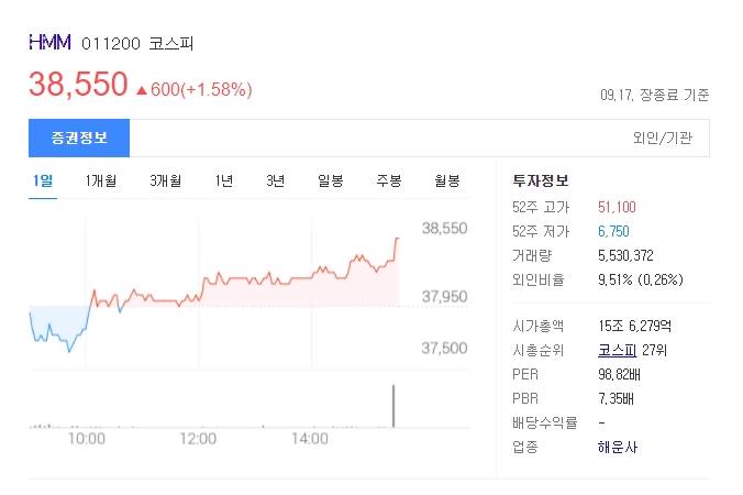 마지막으로 차트 살펴보겠습니다. HMM은 전일대비 1.58% 상승한 38,500원에 종가마감했습니다. 52주 고가는 51100원이었으며 52주 저가는 6750원이었습니다. 시가총액은 15조 6279억원으로서 코스피 27위에 해당합니다.