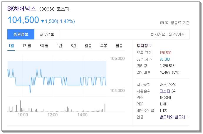 sk하이닉스 주가 전망 마지막은 차트 분석입니다. 전일 대비 1.42% 하락한 104,500원에 종가마감했습니다. 시가총액은 76조 762억으로 코스피 지수로는 2위입니다.